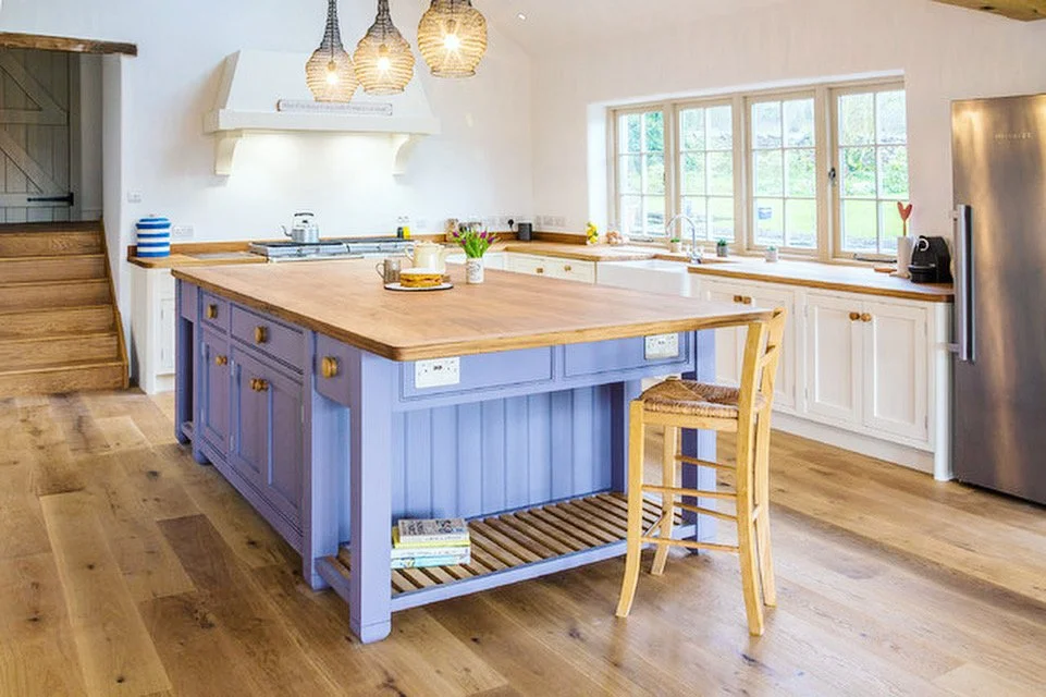 Add a splash of color to your kitchen by doing a two toned color scheme, and adding in a periwinkle island or backsplash.
