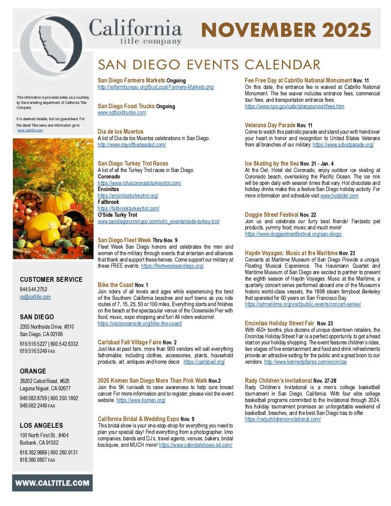 Heading into the second to last month of the year, there is so much to take advantage of to enjoy what the rest of 2025 in San Diego has to offer. From the Turkey Trot races to the Encinitas Holiday Street Fair, there is (as always) truly something for everyone. Enjoy!